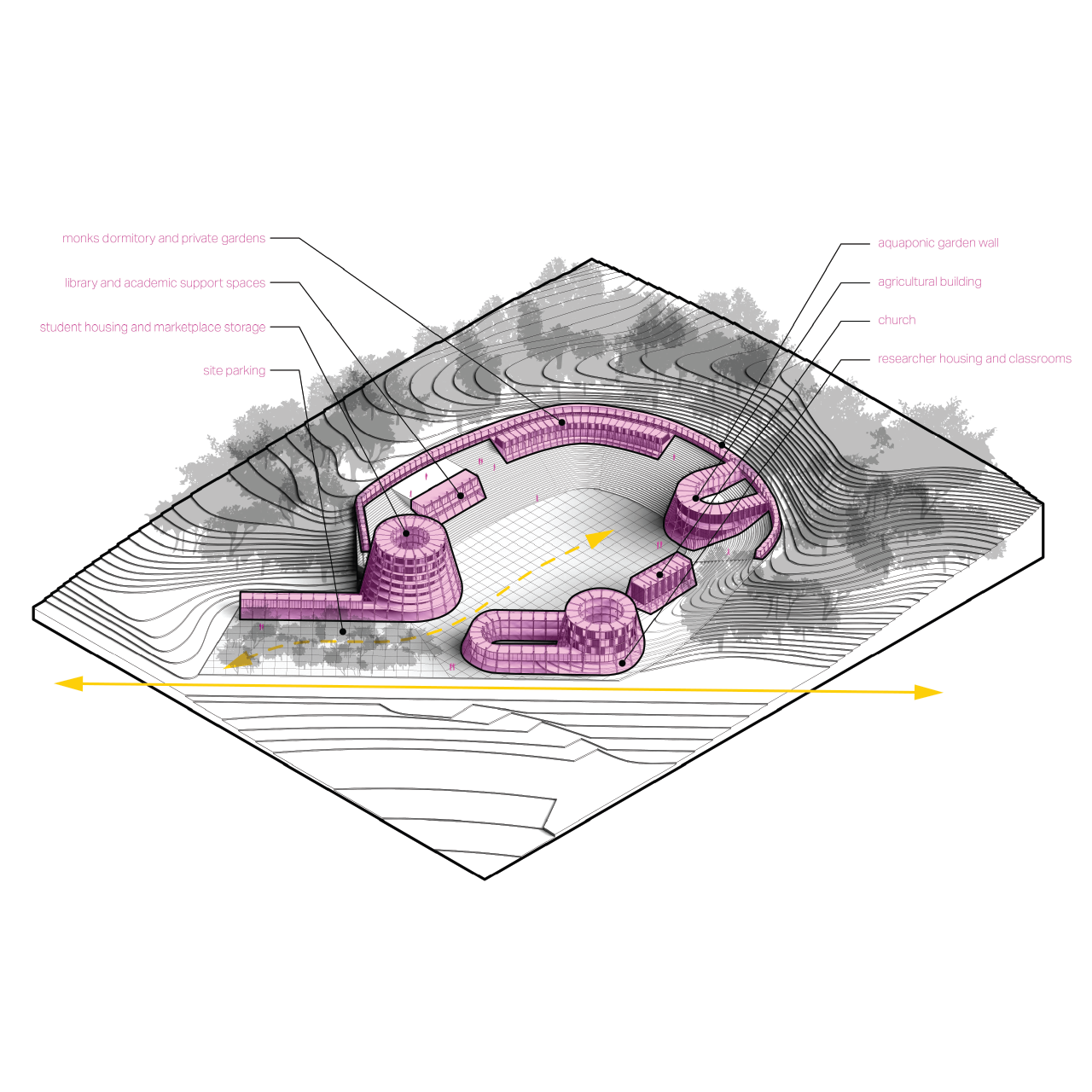 "Out There" is a research about alternative living models for contemporary human settlements using rural conditions as a platform for urban experimentation. The studio is interested in alternative forms of organization and production exceeding traditional linear economies to improve urban habitability, social equality and ecologic balance through landscape reconnection, program reconfiguration and technological innovation.