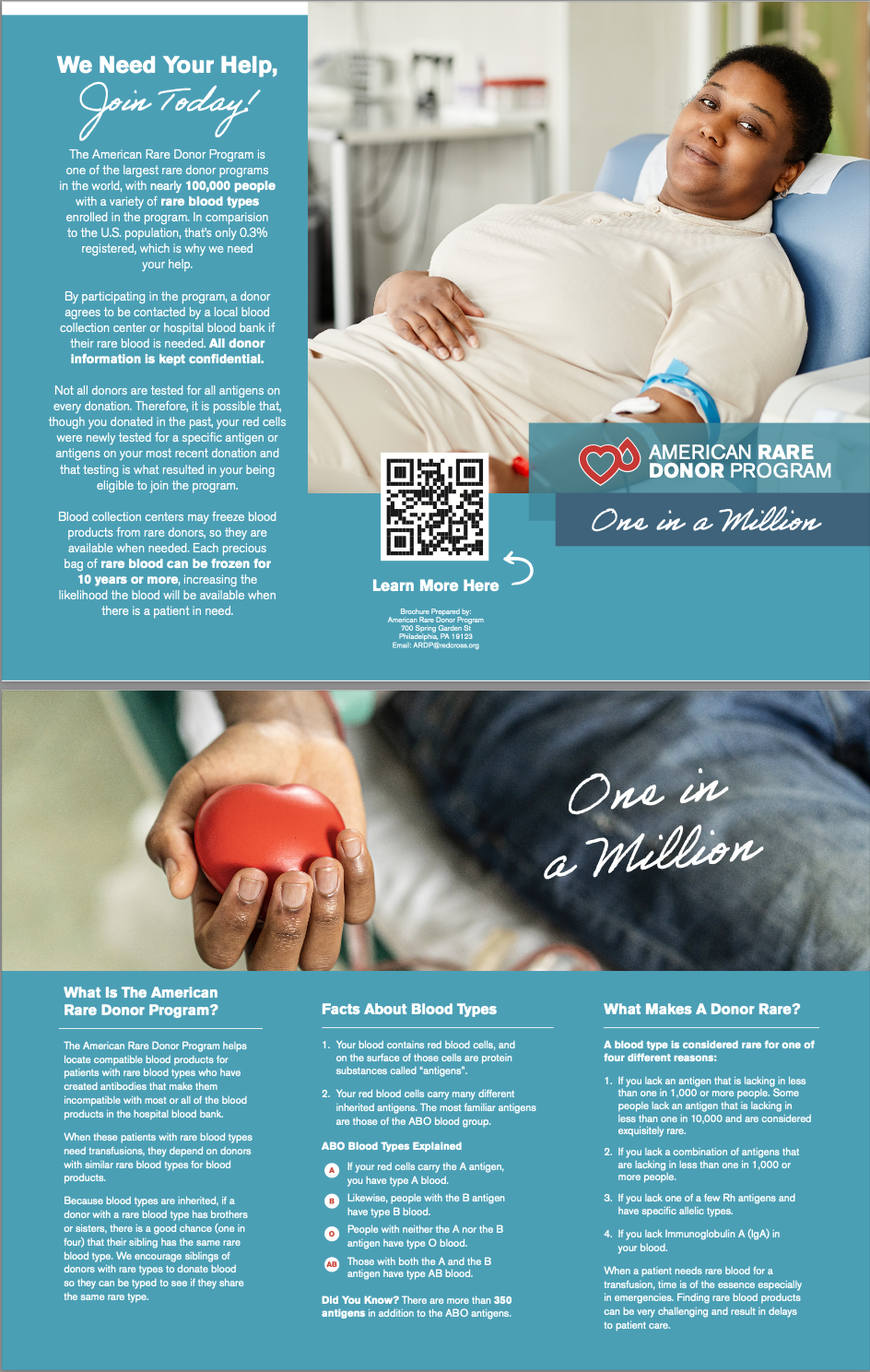 - National Rare Donor Program – If identified to participate in the American Rare Donor Program (ARDP), this allows us to contact you when your specific blood type is urgently needed for specific patients. Click here to read the "One in a Million" brochure and learn more.